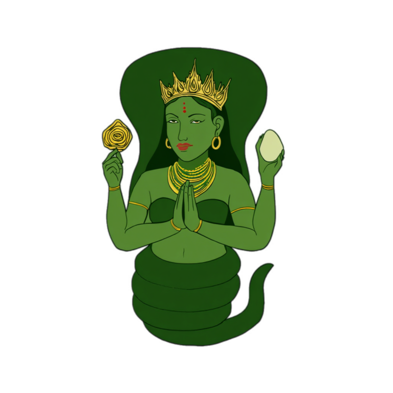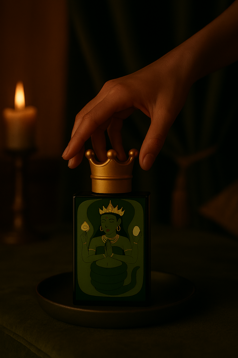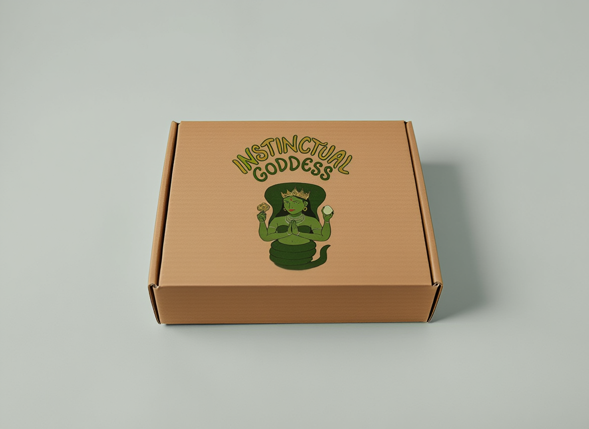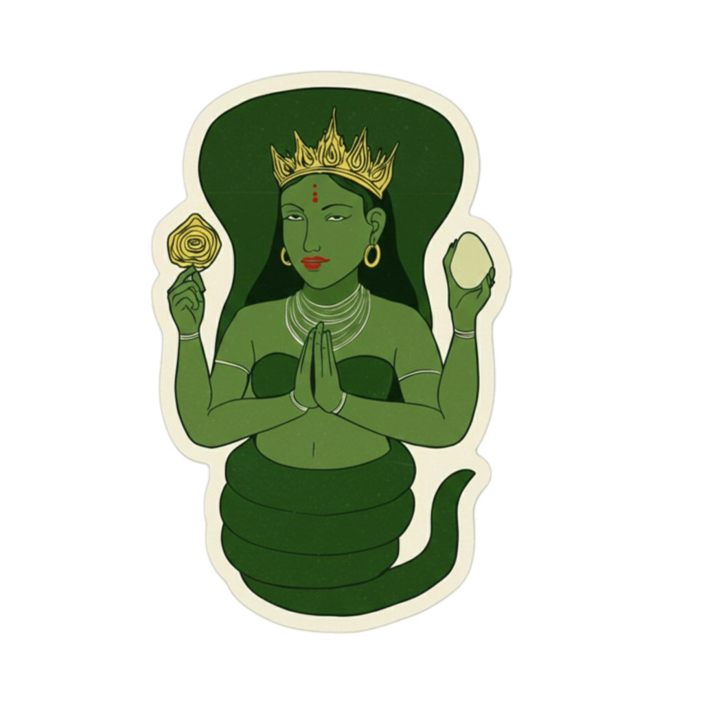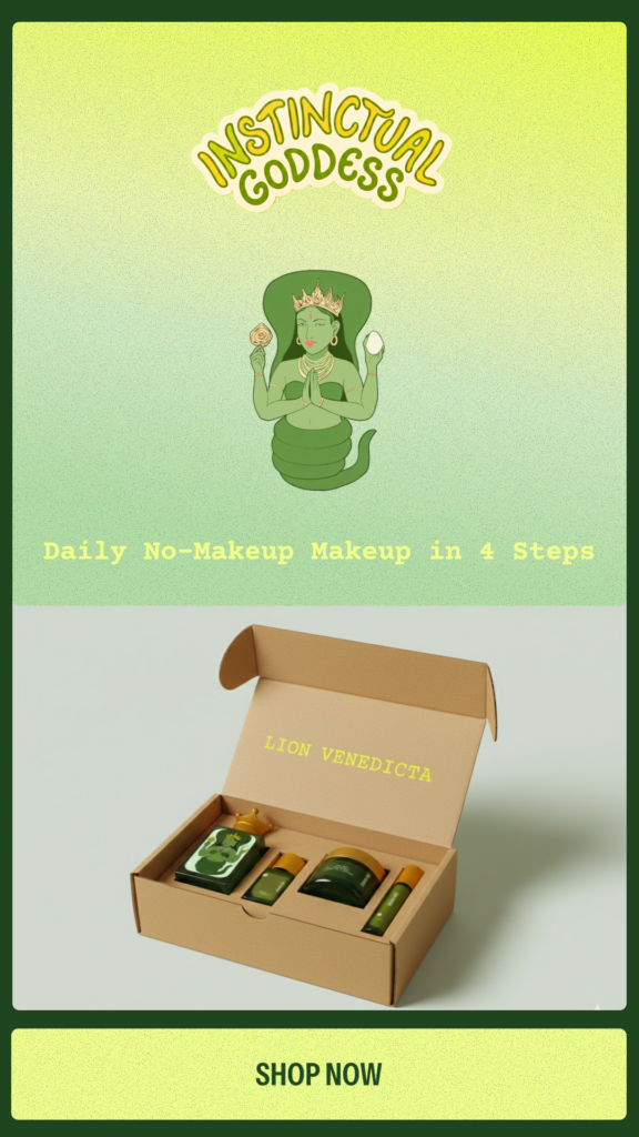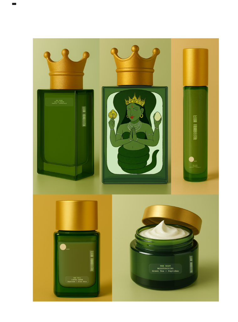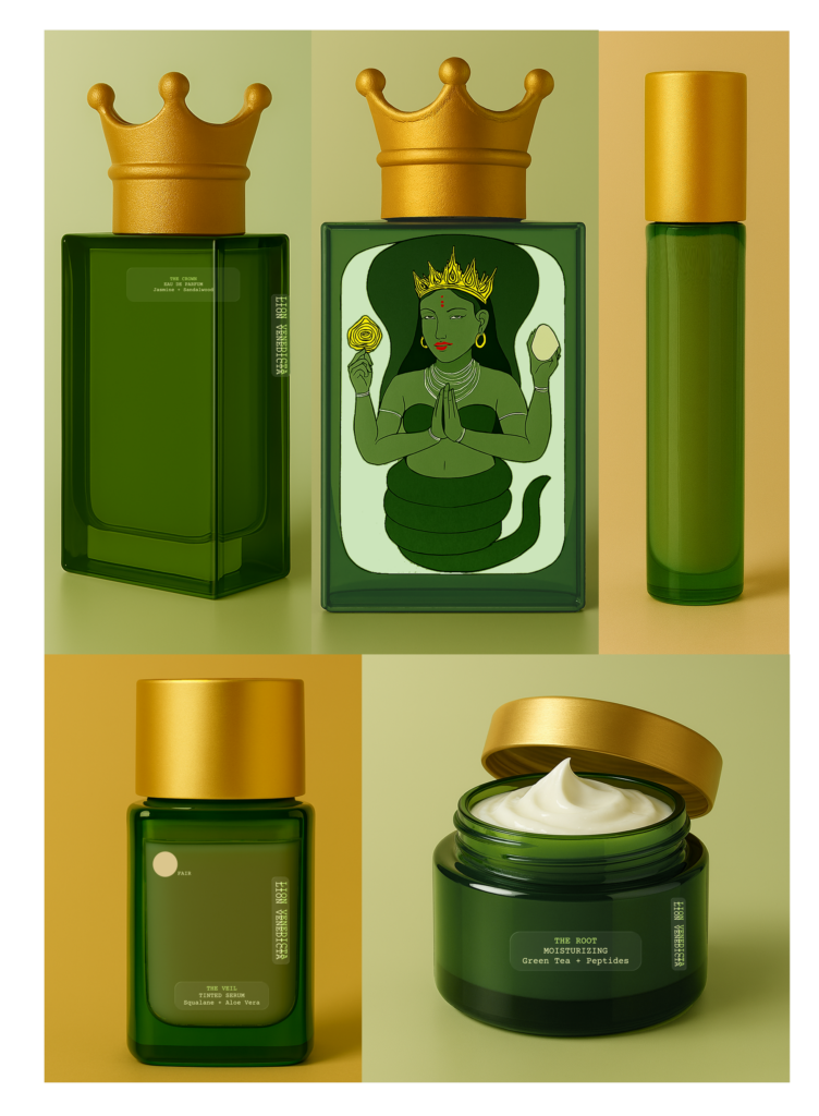 The concept of Lion Venedicta was sparked by a single visual moment: an illustration of a Hindu imagery, taken from an instagram post. The crowned woman is depicted with a lower body coiled like a serpent rather than resting on legs, surrounded by soft, natural greens. This image became the seed for the Green Goddess of the brand concept.