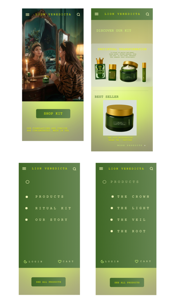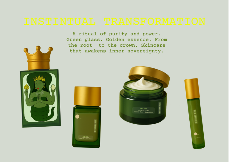 The green goddess archetype taught me that beauty is a state of harmony. My goal was to design a brand that mirrors this: a ritual where every step feels symbolic, and needed but at the same time transformative allowing the wearer to return to a more natural, glowing version of herself.